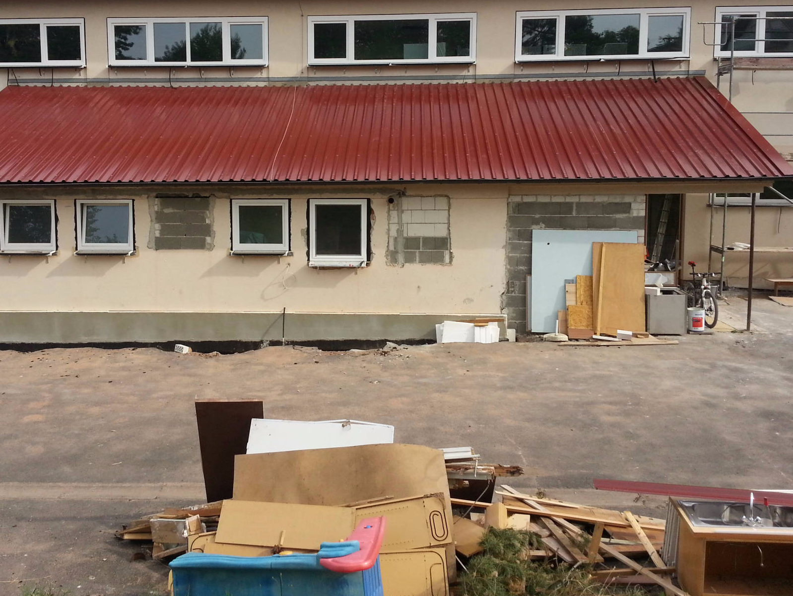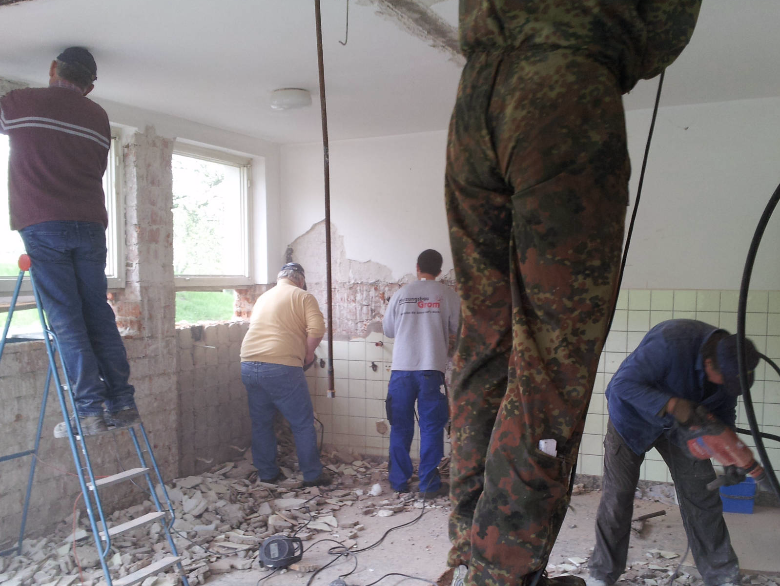 Entrümpelung, Abbau von Regalen, Elektro-/Wasser-/Abwasserinstallatlion komplett neu verlegt, Abwasser nach außen verlegt mit Bagger vom gemeindlichen Bauhof, Fenster tiefer gebrochen, Küchenmöbel vom Verein gekauft/selbst montiert, Fliesenspiegel verlegt, Fußbodenfliesen im Ausbruchbereich ausgebessert.