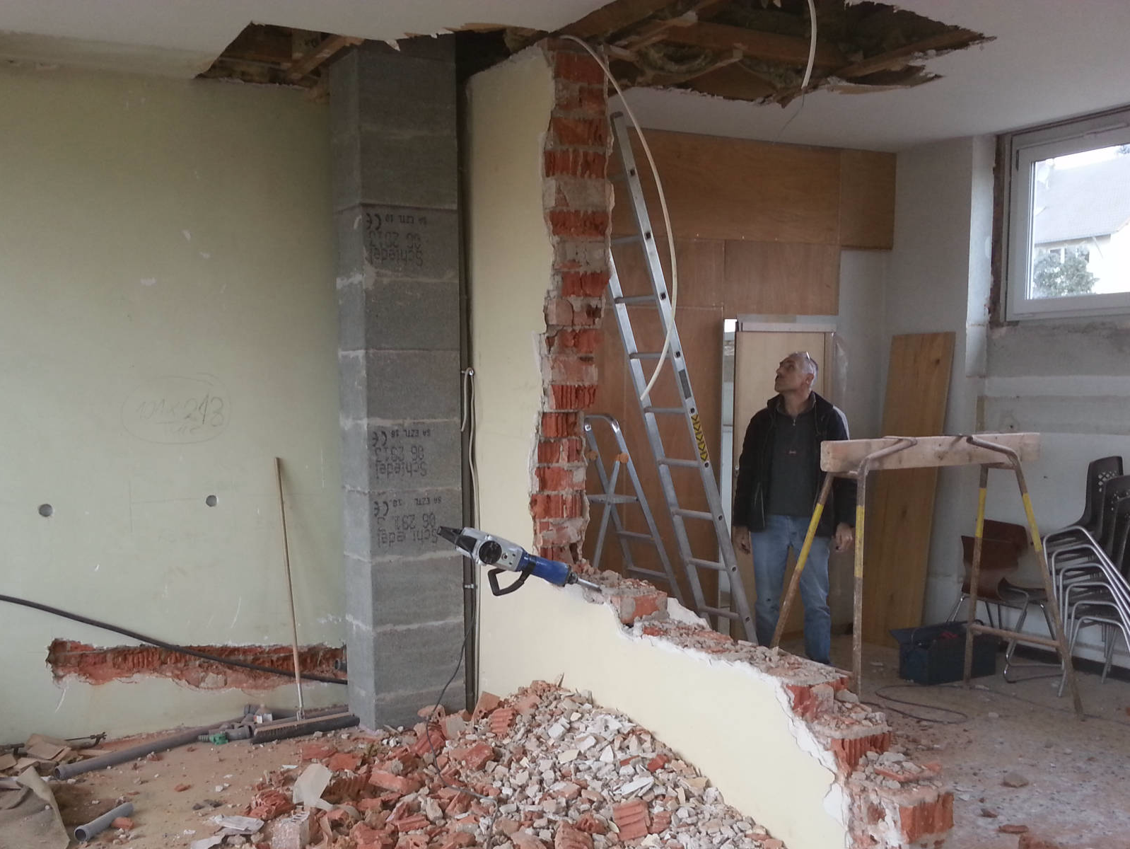 Beidseitig abgemauert, Wände verputzt/mit Putzgrund gestrichen/neuen Putz aufgezogen, Elektroinstallation neu verlegt, alte Bodenplatten entfernt, Sturz Haupteingang innen/Zwischentüre beidseitig mit Gipskarton verkleidet.
