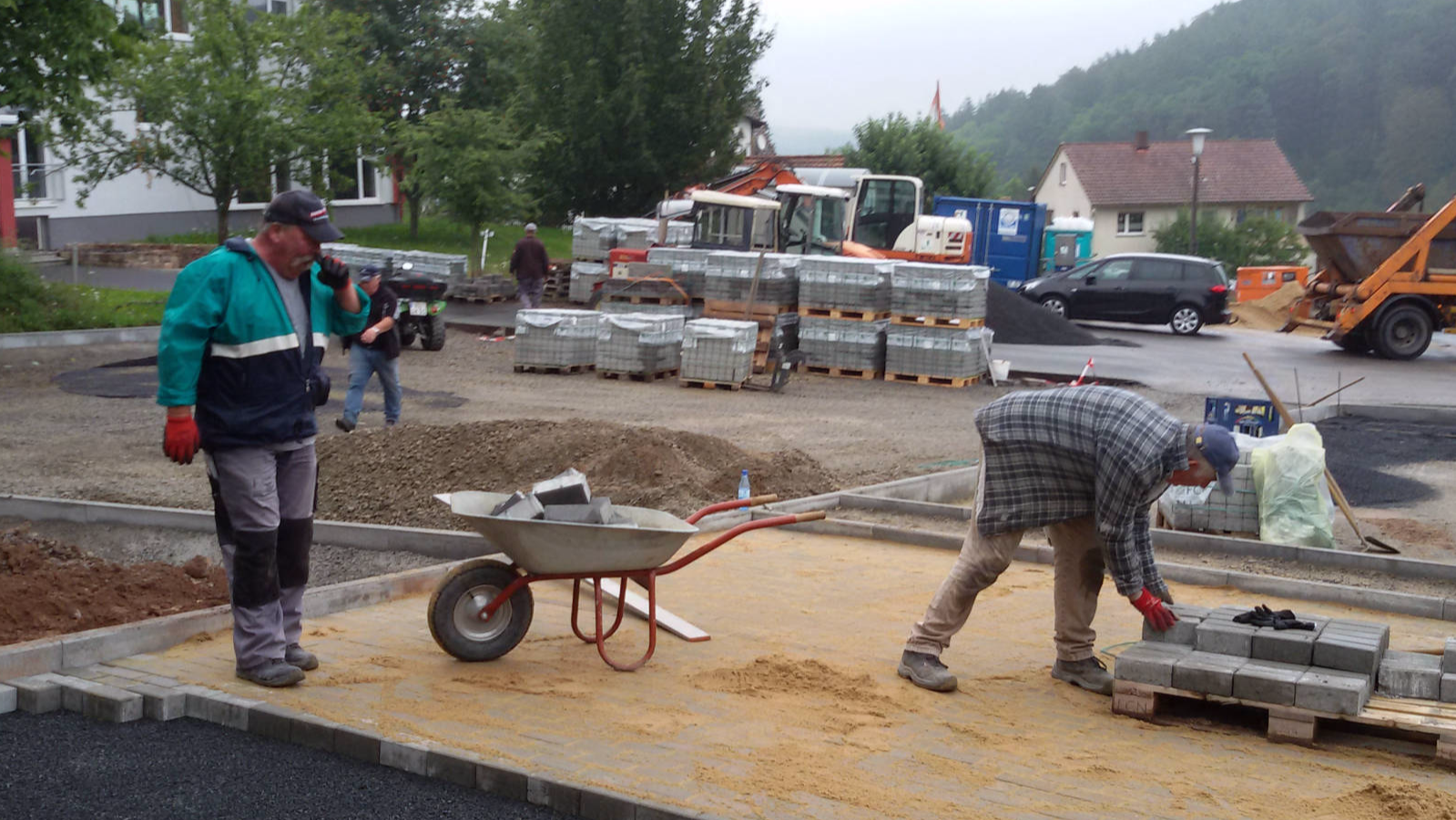 mente (Gemeindebagger), Fundamente betoniert/Beton wurde geliefert, neue Randsteine an 3 Hausseiten als Randstreifen/Mähkante gesetzt, Streifen mit Basaltsteine gefüllt, Feuerwehrzufahrt zum Schulhof verbreitert/L-Steine als Abstützung verbaut/verklebt/verfüllt, Bruch-steinmauer rechts/links vom Heizungsraumzugang ge-mauert, Bruchsteine vom Bauhof gelesen/Transport Gemeinde-LKW, Wasserrinnen beim Heizungseingang u. Wassereinlass im Bereich Hintereingang gesetzt, Treppen-stufe Haupteingang/Fundament ausgebaggert/betoniert, Asphalt geschnitten bei den Eingangsbereichen, Rinnen-steine Gebäuderückseite/Schulhofmitte gesetzt, Pflaster-arbeiten Hintereingang/Außeneingang zum Heizungsraum, Parkplätze vor Schule gebaut, Baggerarbeiten durch Bauhof mit Schottereinbau/Fläche 440 m², Parkplatzum-randungen gesetzt, Schotter/Split eingebaut, Parkplatzbau allein 539 Stunden Arbeitszeit, Fundamente vom ganzen Gebäude frei gelegt/Bagger vom Bauhof, Fundamente im Zuge der Wärmeschutzverkleidung neu isoliert, Blitz-