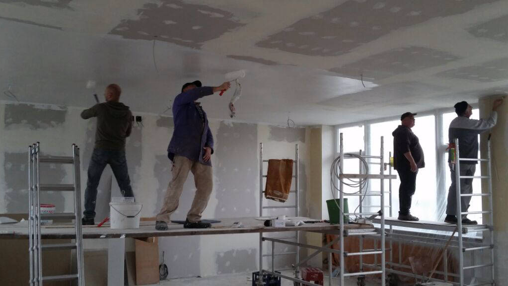 Wände überspachtelt/eingelassen/Putz aufgezogen, alte Oberlichter ausgebaut/FB montiertinkl. Maßgeschnittener Streifen und Einputzarbeiten, neue Fenster eingeputzt, Decke ausgebessert/gestrichen.